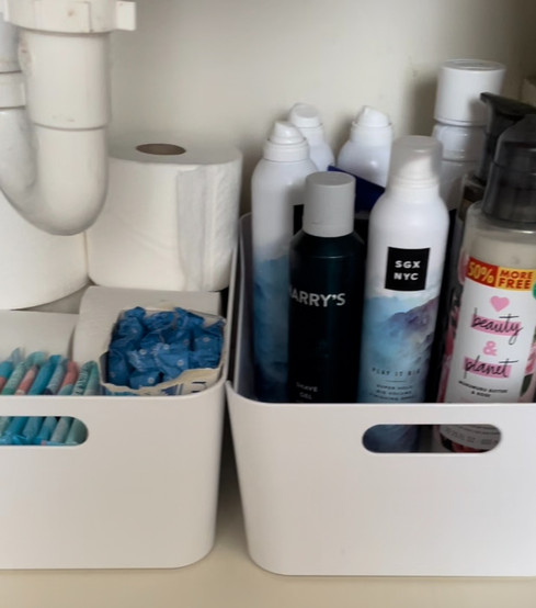 BATHROOM: lotions, soaps, hair styling products, hair dryer and curling irons, toiletries, feminine products, medicines